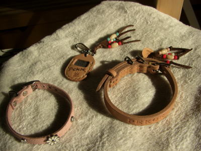 そして右がおにゅーの首輪!!かっちょえーでしょ~?作りもとっても丁寧でしっかりとしていて安心感があります^^ 「PEKOE」と名入れもして頂きましたよ。着色もしていただけるとのことでカラーサンプルを見せていただいたりして検討したのですが、着色無しで自然な色合いの変化を楽しんでいくことに決めました。丈夫な革を使用しているので正しいメンテナンスをすれば長期間の使用が可能だそうです。真ん中は今回首輪をお願いする以前に作っていただいたタグケース♪これもお気に入りです^^