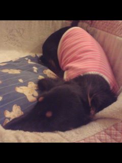 でも普段より寝ている時間が長いような・・・。冷えたせいとかだったりするかしらん・・とお洋服を着せました。といってもTシャツなんで保温効果はそんなにないかな。ワタシの気持ちの問題?^^;